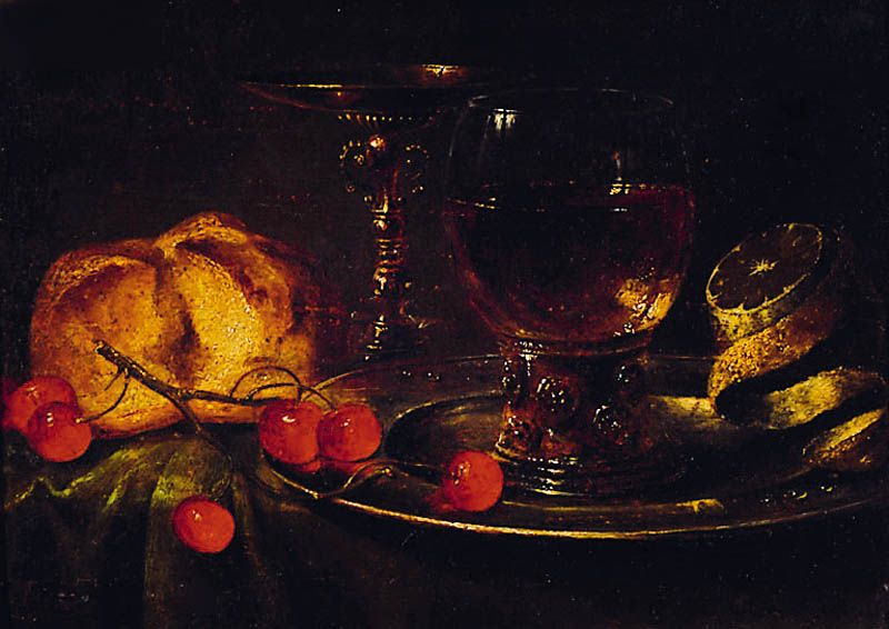 Stilleben mit Weinglas, Kirschen, Zitrone, Brot und Messingschale