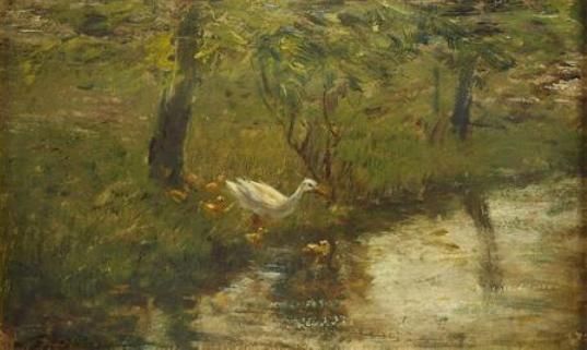 DUCKS AND DUCKLINGS ON A RIVERBANK