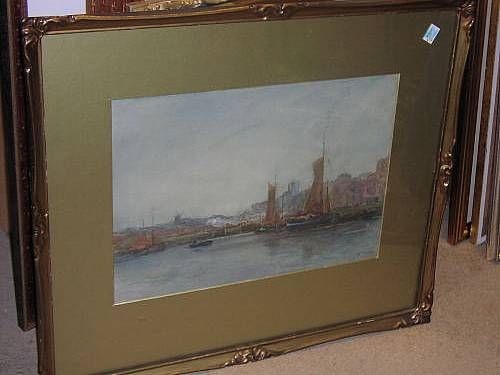 Dutch coastal scene with boats with windmill in left distance