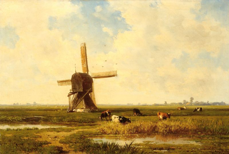 Cows by a mill in a polder landscape