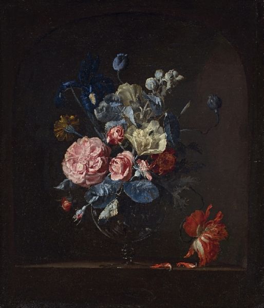 GLASVASE MIT ROSEN, IRIS, TAGETES UND TULPE IN EINER NISCHE