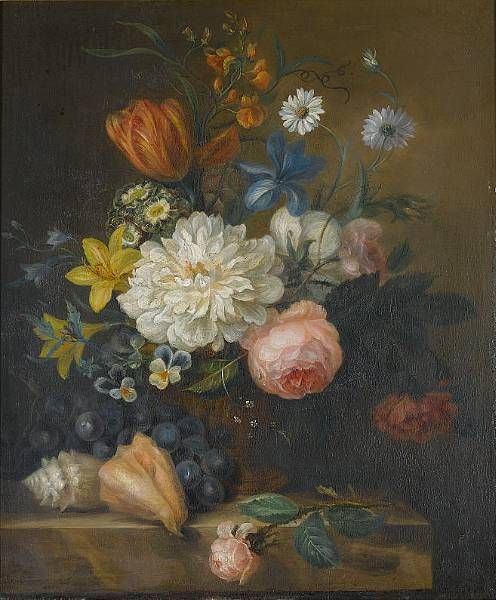 | Roses, a tulip, violets, an iris and other flowers in a bronze urn with a rose, conch shells and grapes on a stone ledge | |