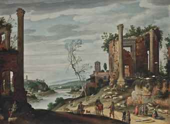 | A river landscape with classical ruins, shepherds and shepherdesses and their flock | |