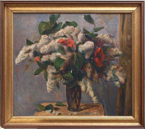 | Glasvase mit prächtigem Strauß aus weißem Flieder auf einem kleinen Tischchen vor changierendem Hintergrund | |