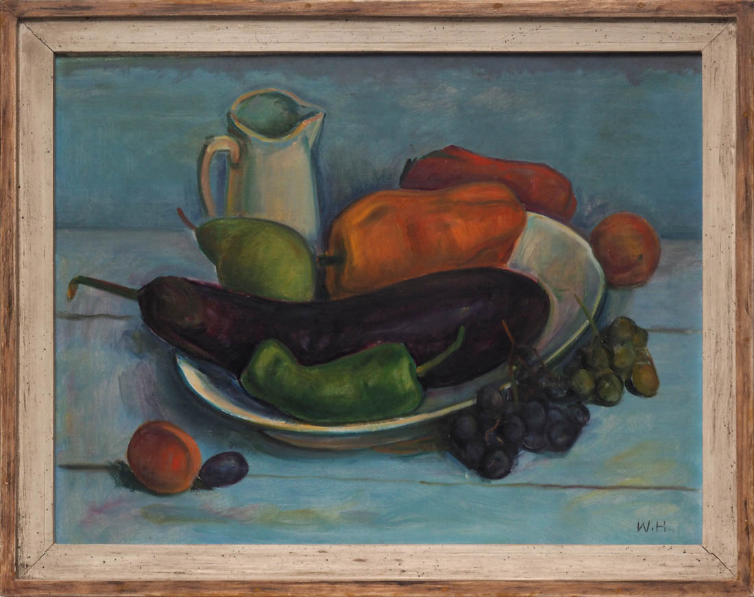 Obst- und Gemüsestilleben mit Keramikkrug vor changierendem Hintergrund