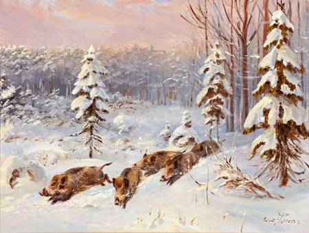 Wildschweinrotte in Winterlandschaft