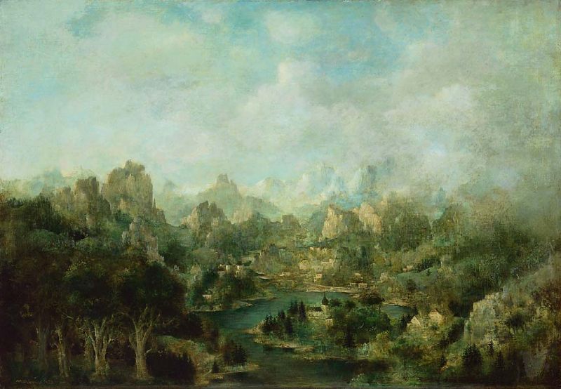 Weite Sommerlandschaft mit See, Burg und Kirche