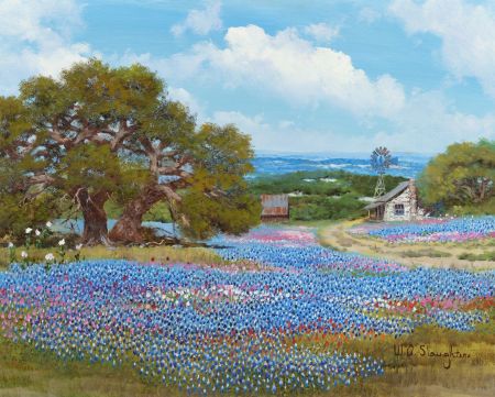 Old Stone Farmhouse and Windmill in a Bluebonnet Field