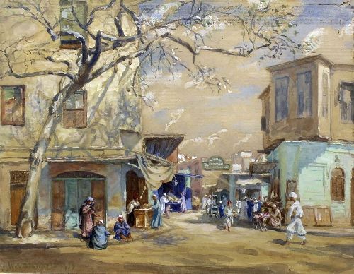 Middle Eastern street scene - Thought to be Cairo, with figures seated on pavement