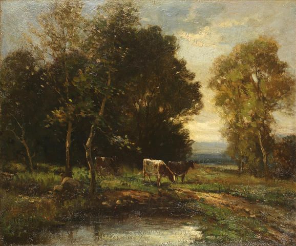 Cattle grazing by a pond in a wooded Landscape