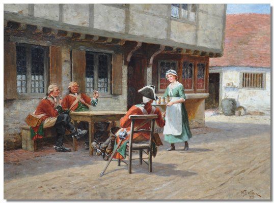 | soldiers by a table outside a tavern, with serving maid, with a tray of tankards of ale | |