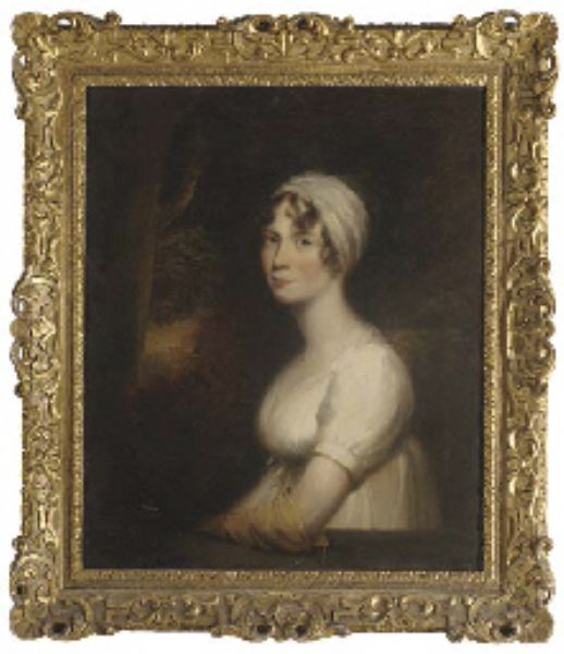 | Portrait of Miss Morley, three-quarter-length, in a white dress and yellow glove, a landscape beyond | |