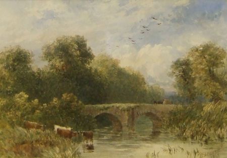 River Landscape with Cattle Watering by a Stone Bridge
