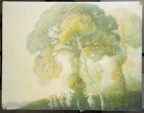 A treed landscape with women dancing
