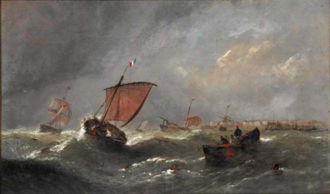 | LUG SAIL RETURNING INTO PORT; FISHING BOATS IN THE CHANNEL | |
