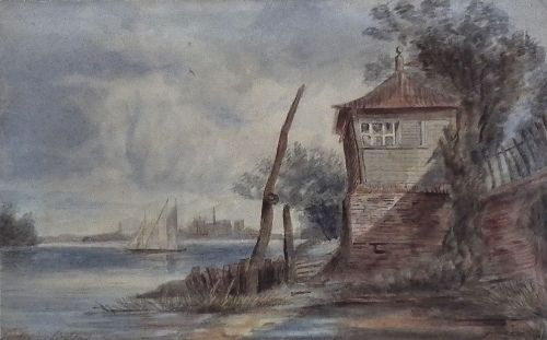 River landscape with cottage to bank