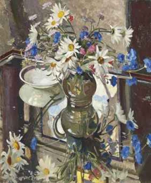 | Still life of daisies and cornflowers in a glass jug | |