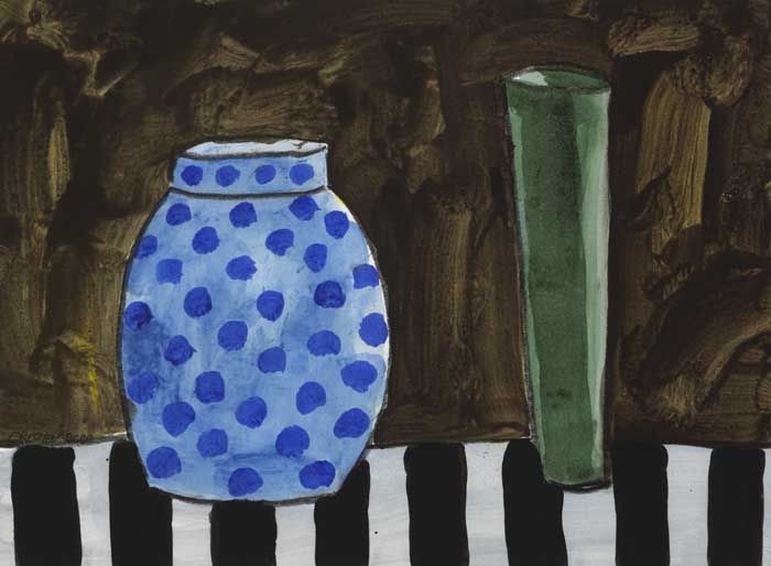 STILL LIFE WITH BLUE POLKA DOT VASE AND GREEN FLUTE VASE