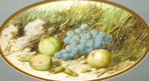 Still life of grapes, and apples, pears and plums on a sandy bank