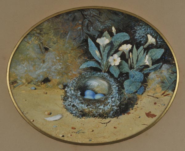 | A pair of oval still lifes of birds' nests and primrose against a mossy bank | |