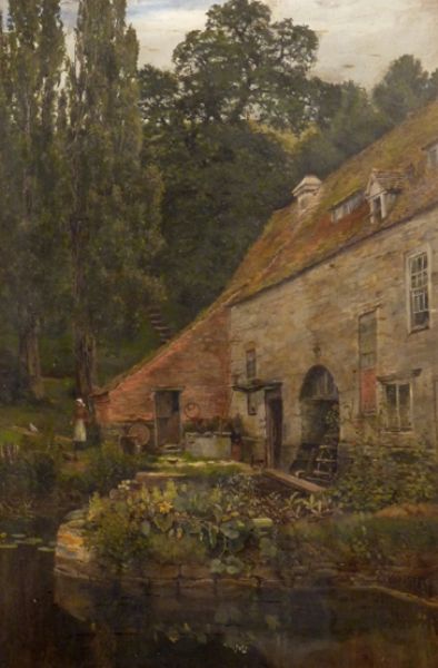 A WATERMILL WITH A WOMAN FEEDING CHICKENS