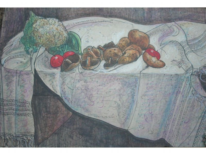 STILL LIFE WITH CAULIFLOWER, POTATOES, MUSHROOMS AND TOMATOES UPON A DRAPED TABL
