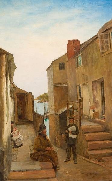 Figures in a harbourside lane, thought to be St. Ives