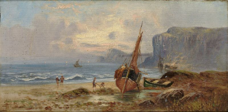 Segelboote am Strand; felsige Küste und Abendrot
