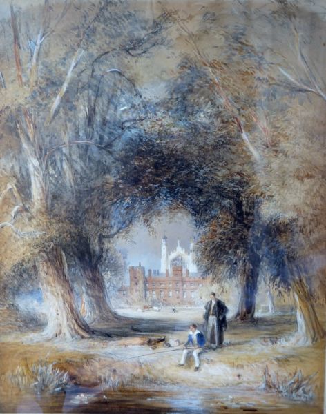 | Boy fishing with a Master behind beneath trees, with distant view of Eton College Chapel | |