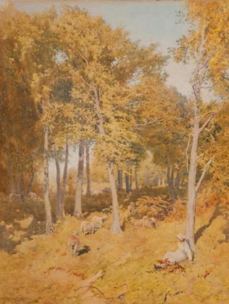 | A Summer's Day, Ashdown Forest, Sussex - a young girl seated beneath a tree, sheep grazing in woodland beyond | |