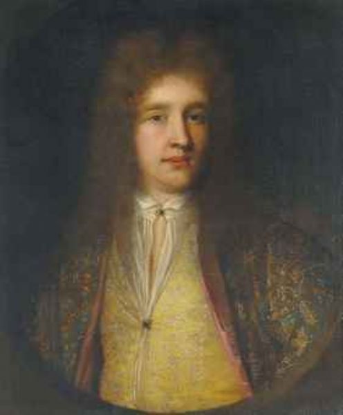 | Portrait of a gentleman, bust-length, in a green coat and yellow waistcoat, both with floral embroidery, in a feigned oval | |