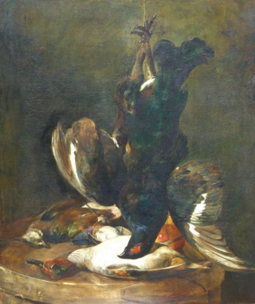 Black cock, teal, lapwing and snipe hanging and / or on a ledge