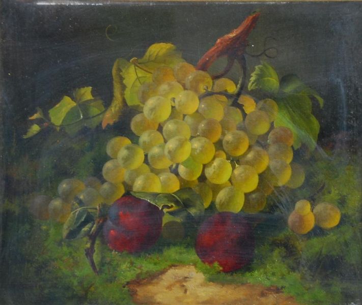 | Still life - bunch of grapes and two plums on a grassy bank | |