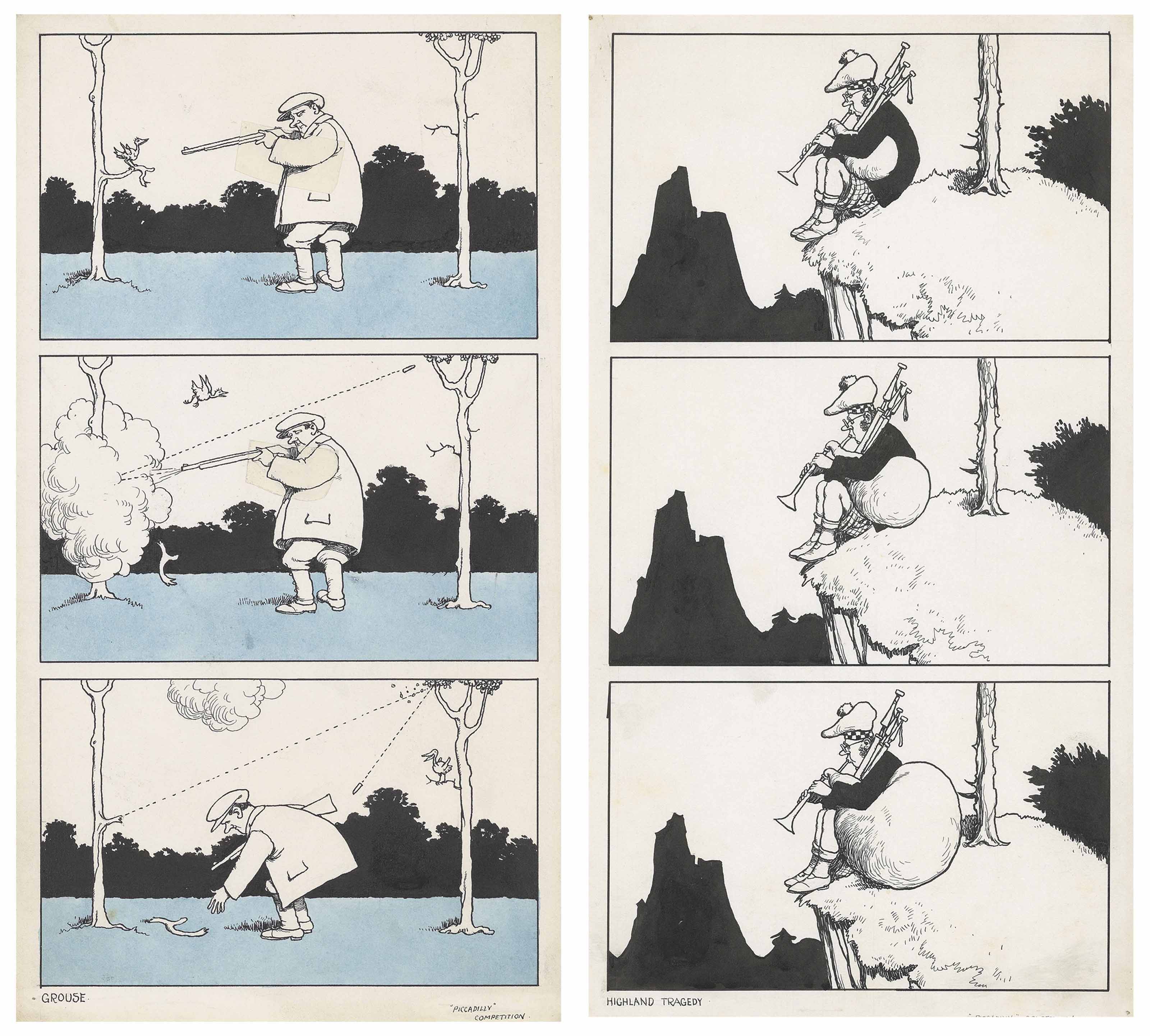 | Original drawings for 'The Piccadilly Competition', 1929: Grouse; and Highland Tragedy | |