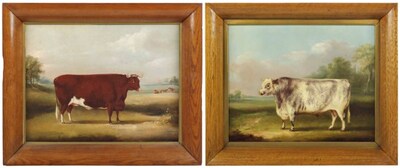 | A prize bull in a landcape; and a prize cow in a landscape | |