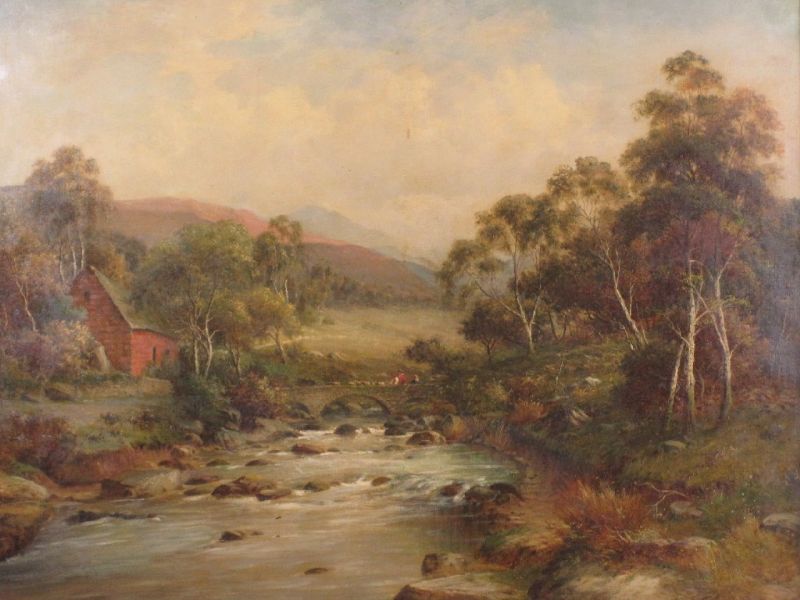 | A Welsh river Landscape with Children driving Sheep on a Footbridge near a cottage | |