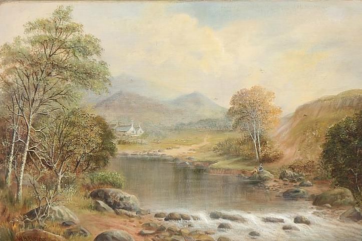 Welsh landscape with two fishermen at a river