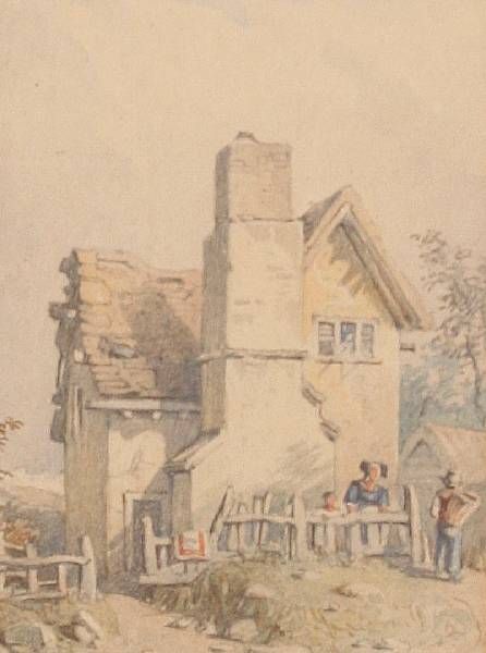 Figures outside a cottage