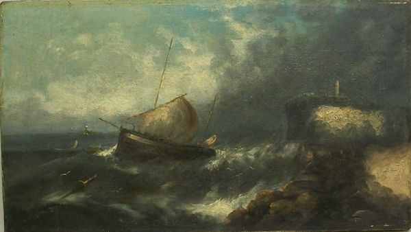 | a ship in stormy seas with broken mast, lighthouse and figure to shore | |