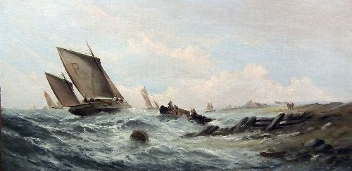 | Marine scenes with barge and sailing boats in choppy seas off coast | |