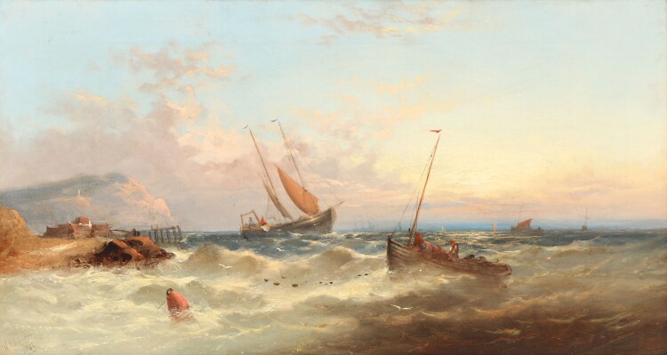 | Seascape with fishing boats in a squall off the coastline | |