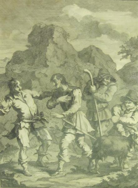 Six illustrations for Don Quixote including The Unfortunate Knight of the Rock meeting Don Quixote