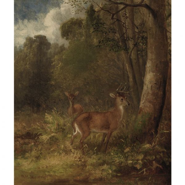 Young Stag and Doe in a Wooded Landscape