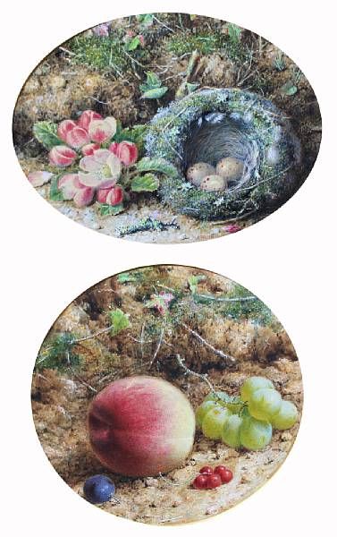 Spring blossom and a bird's nest; A peach, green grapes, redcurrants and a damson