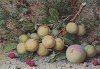 Still life with peaches and raspberries on a bank