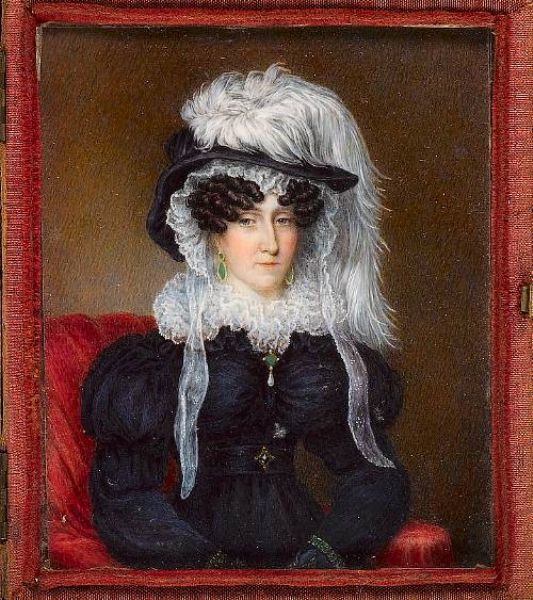 | A lady, half length, seated, wearing dark blue dress with frilled lace collar, matching untied bonnet and dark blue hat decorate | |