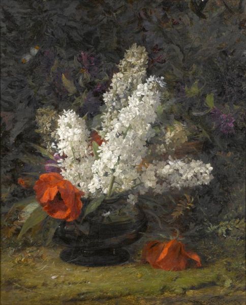 | STILL LIFE WITH WHITE LILAC AND POPPIES IN A GLASS VASE BEFORE A GARDEN WITH CLEMATIS AND A BUTTERFLY | |
