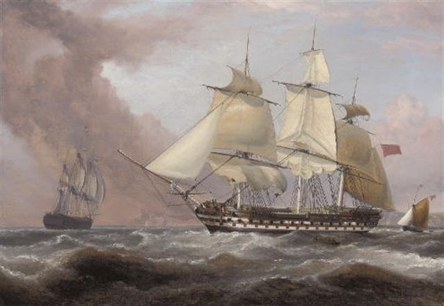 | The East Indiaman Earl Balcarres hove-to and dropping her pilot off Dover, with the pilot cutter in attendance astern | |