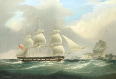 The full-rigged merchantman Annandale heaving-to for the arrival of the pilot cutter