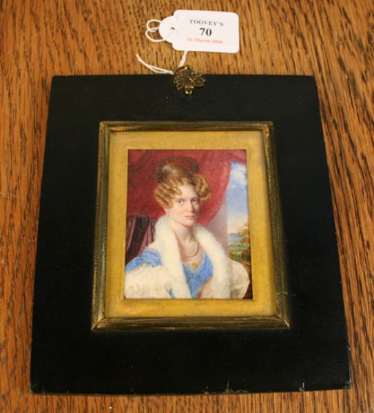 | Miniature Head and Shoulders Portrait of a Lady wearing a Fur Stole and Blue Dress, a Curtain revealing a Landscape beyond | |